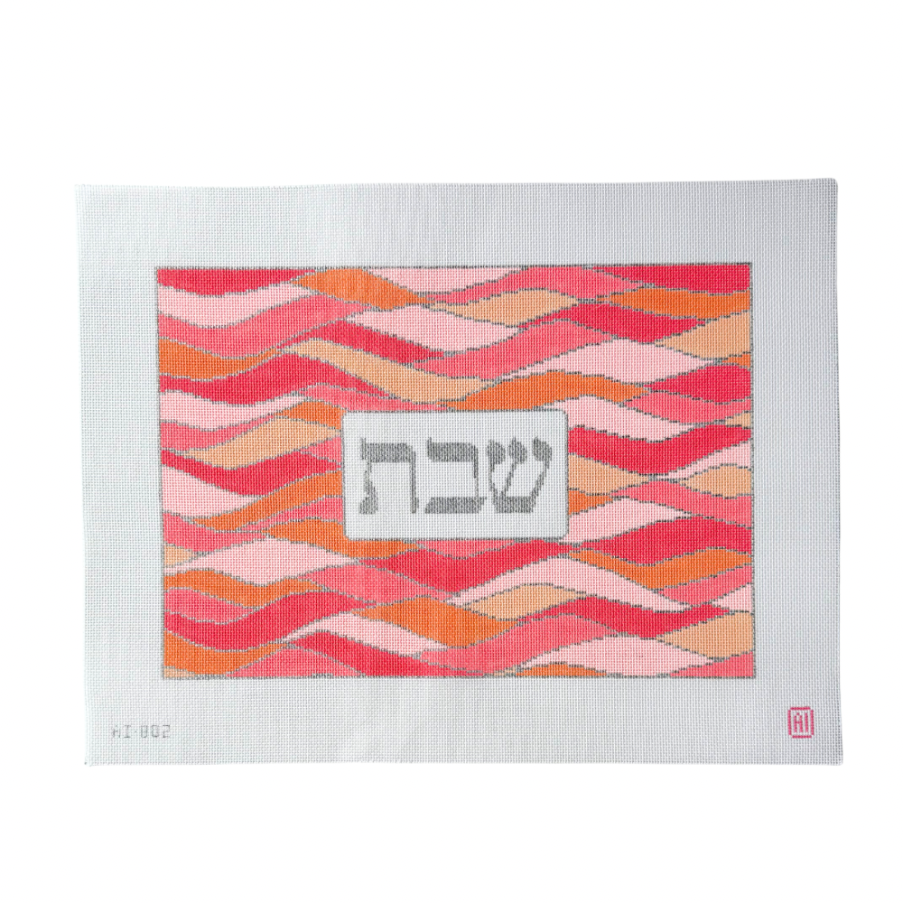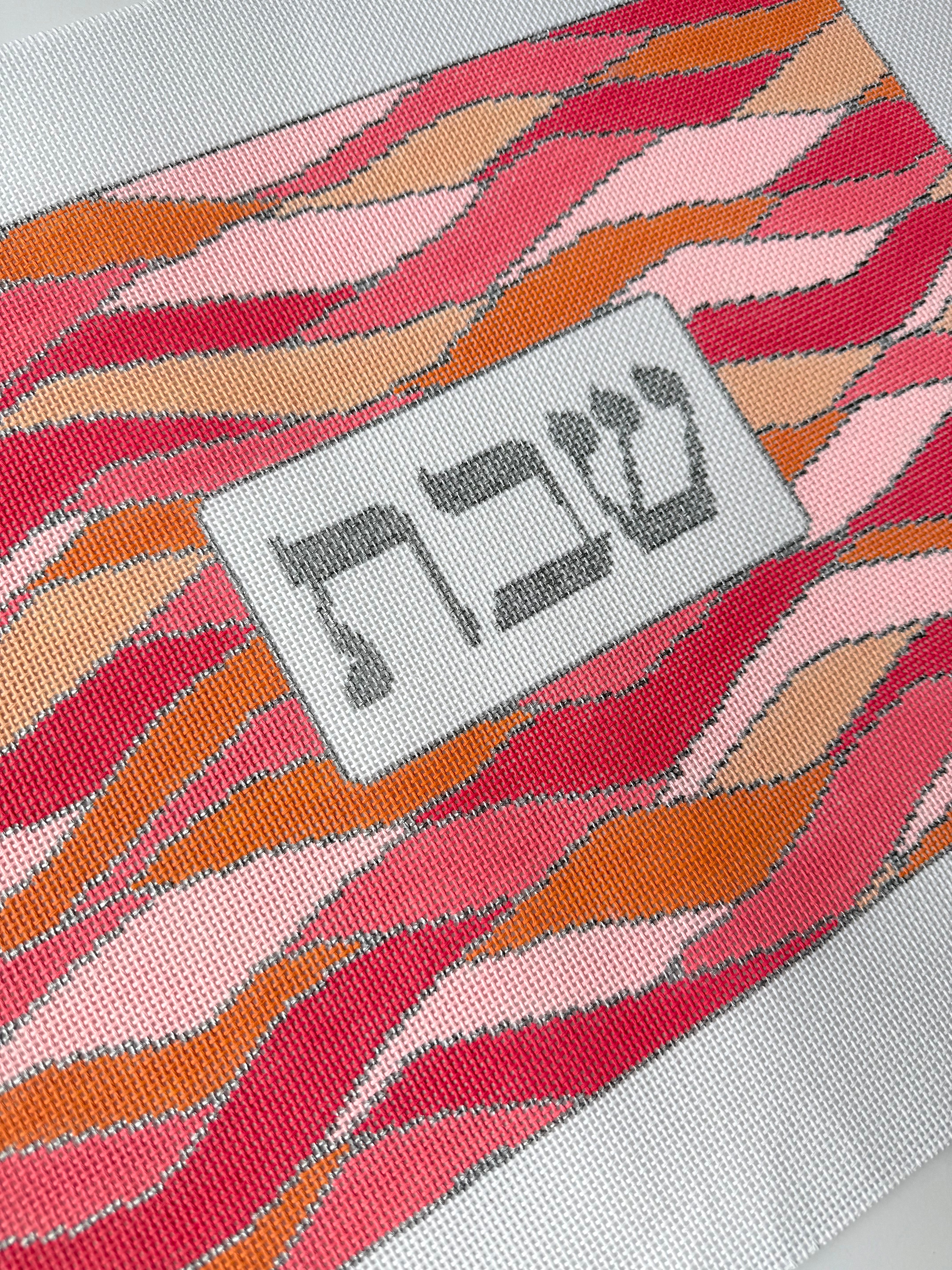Miami Waves Challah Cover needlepoint canvas features coral and pink waves with a glimmer of silver on 13-Count Mono Deluxe Zweigart Mesh. Available with or without text. (Hebrew translation: Shabbat)
