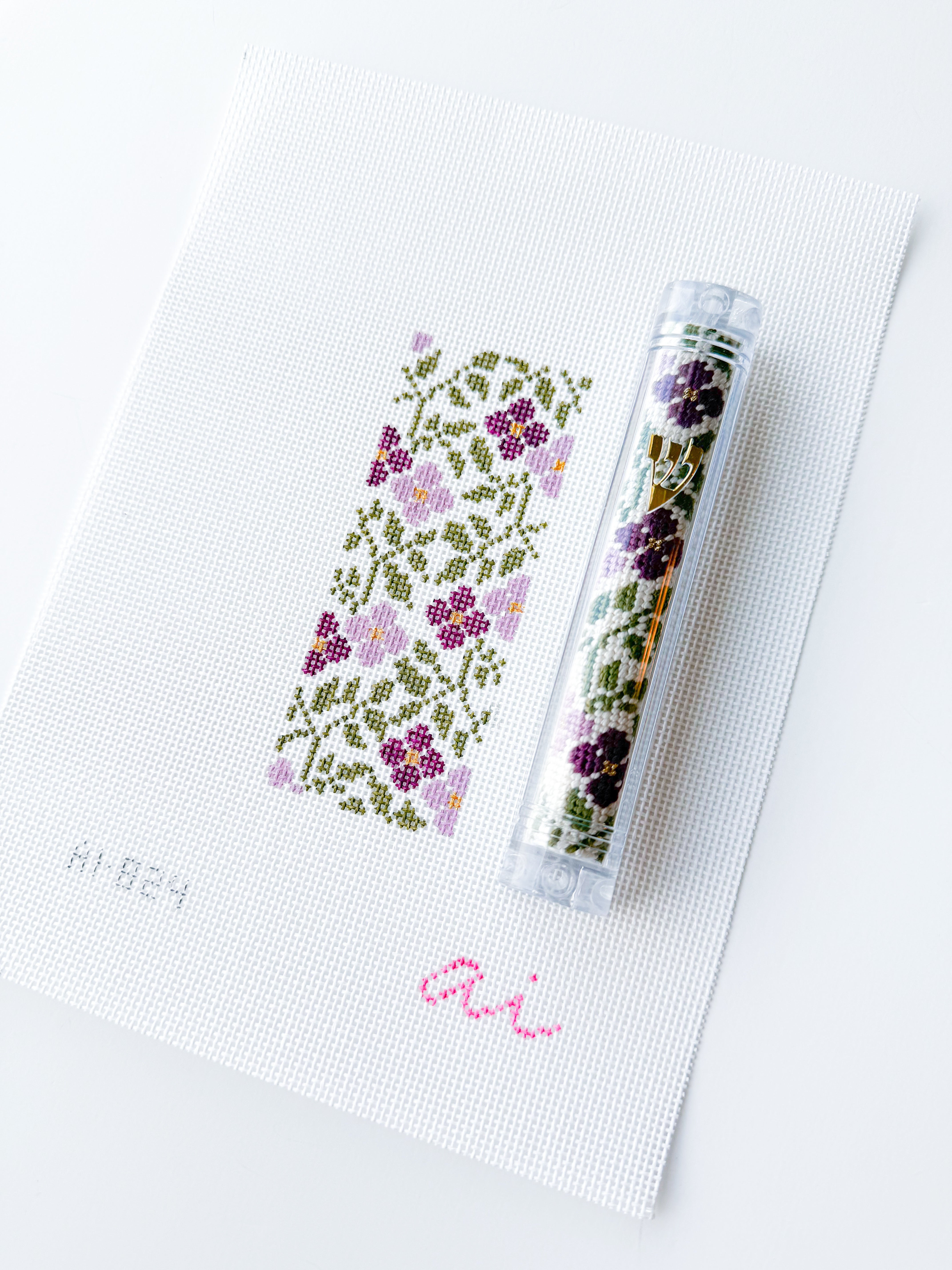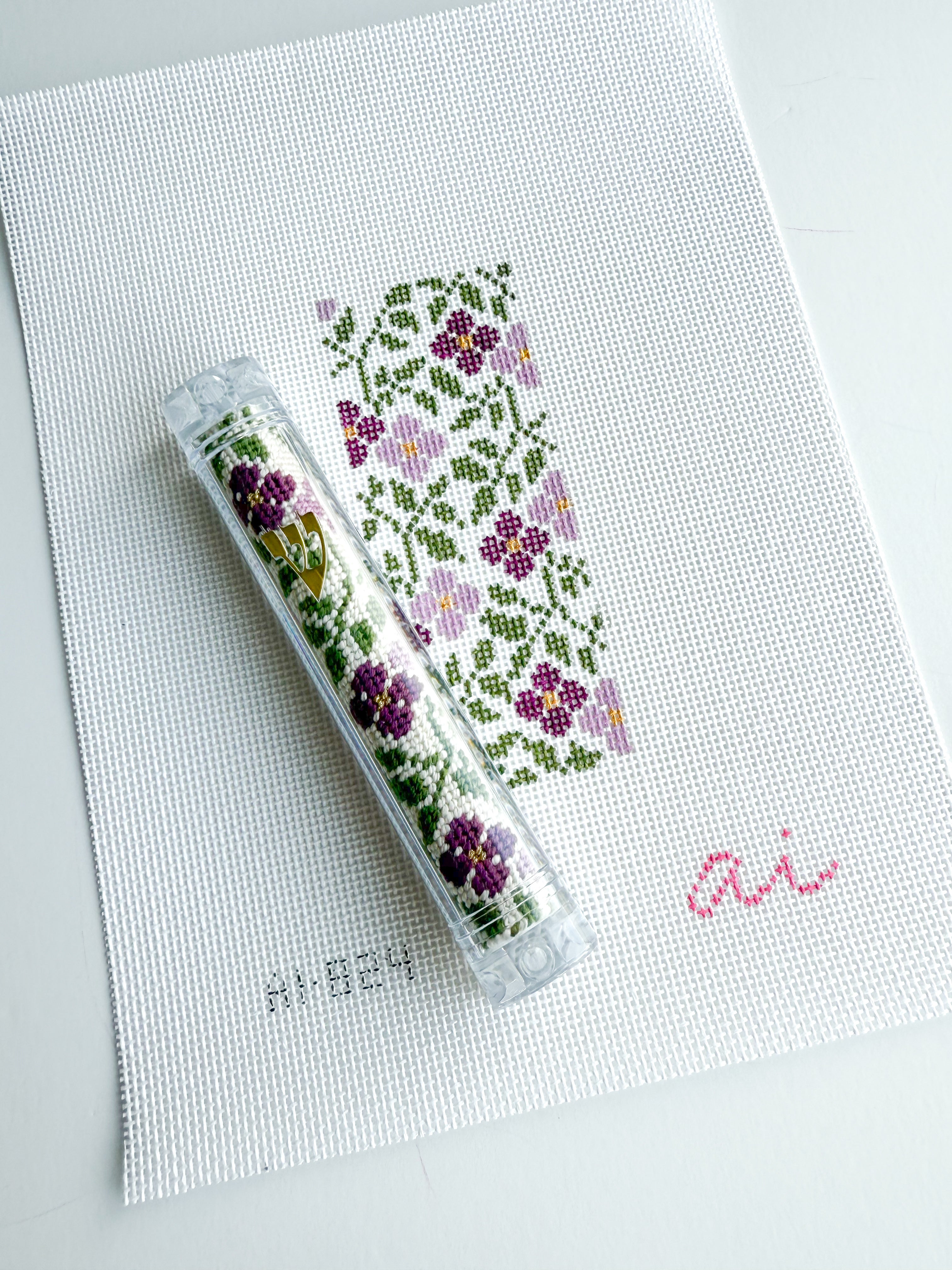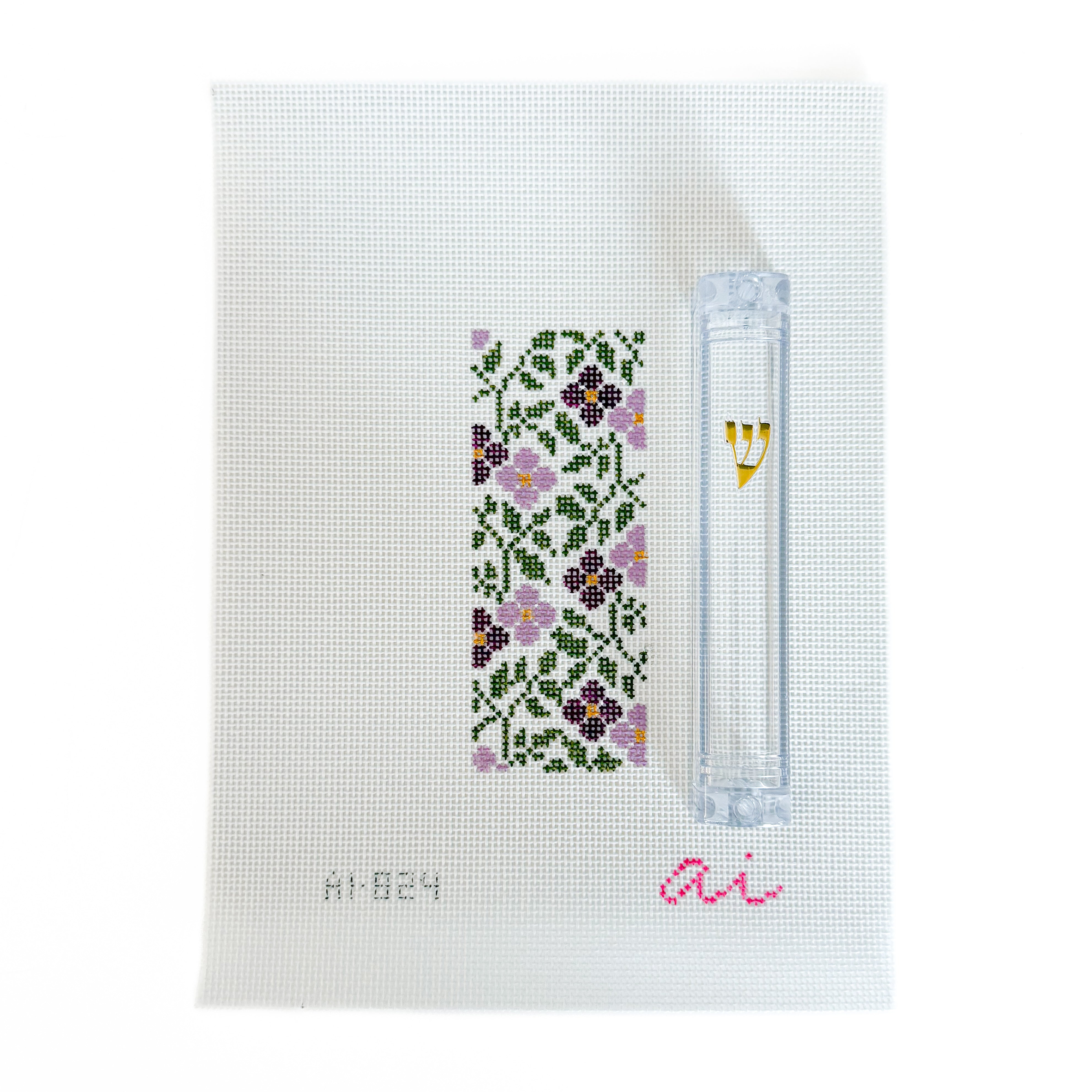 Our Vine Mezuzah needlepoint canvas was inspired by my wedding Ketubah, a Jewish marriage contract. The design features purple flowers and green vines, with a touch of gold metallic.
