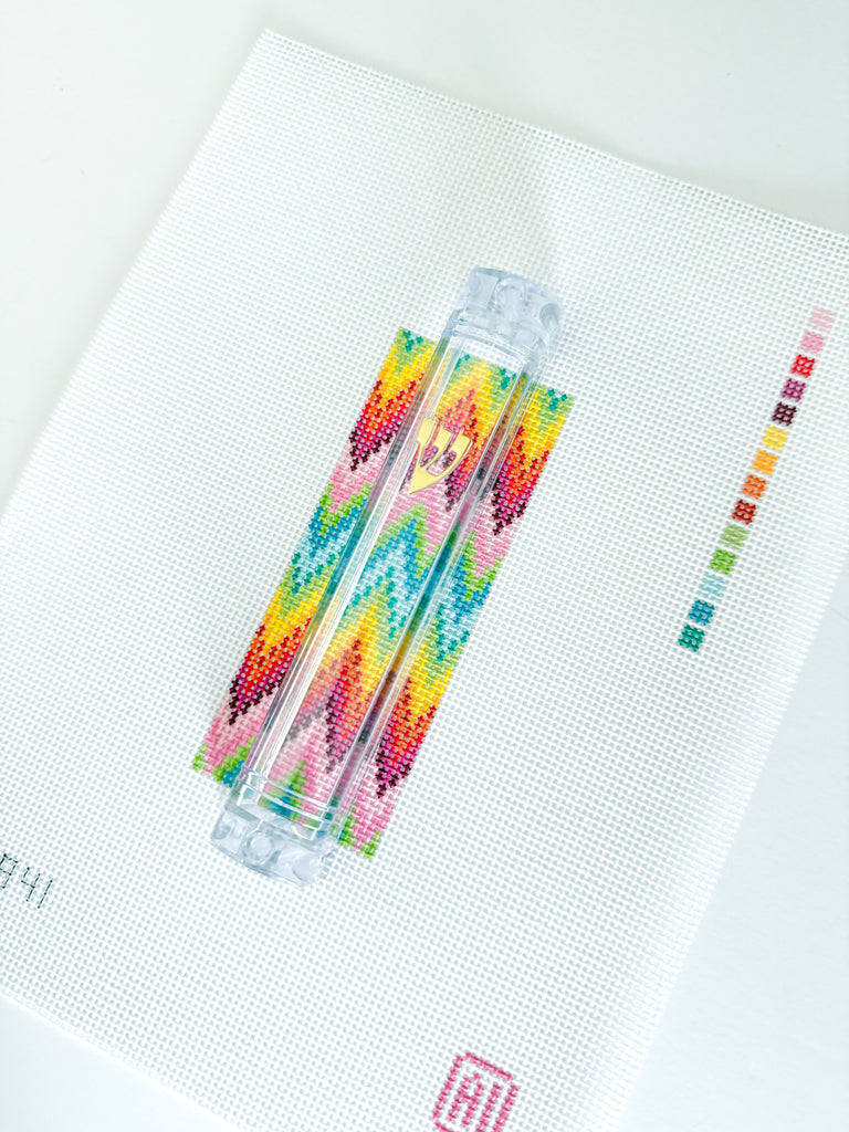 Our Missoni Mezuzah needlepoint canvas features vibrant zig zags inspired by Missoni. Hand painted on 18-Count Mono Deluxe Zweigart Mesh.